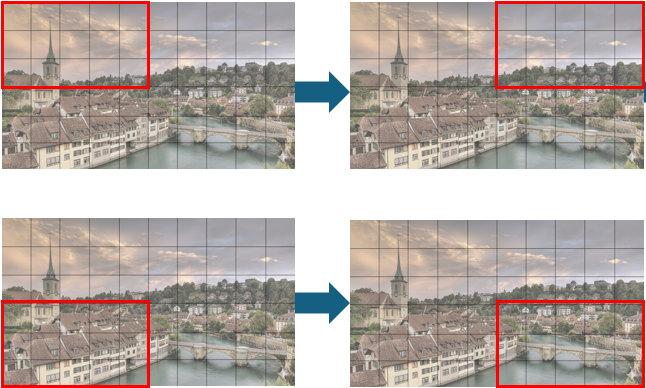 앞서 강조했듯이 이미지의 일부분을 차례대로 훑어 보면서 이미지 전체를 파악하는 것이 CNN 의 기본 메커니즘입니다. 예를 들어 아래 그림과 같이 5x3 빨간 상자를 만들어 내부를 보고 다음 부분으로 이동을 시키면서 전체 부분을 살펴볼 수 있습니다. 따라서 부분들에서 얻어진 정보를 모아 이미지 한 장을 해석하기 때문에 이미지를 벡터로 만들었을 때보다 객체의 크기와 위치에 덜 민감합니다.