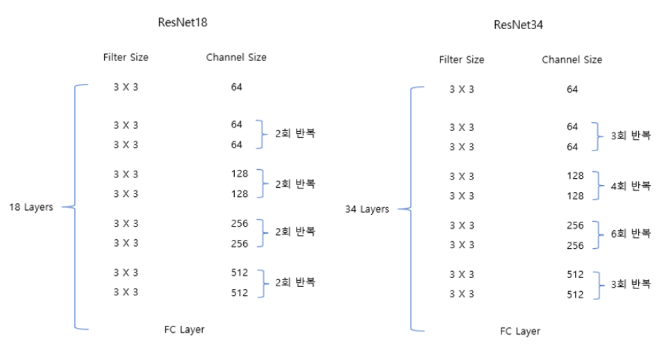 # ResNet18 = [2, 2, 2, 2] -> 각 스테이지에 블록 2개씩