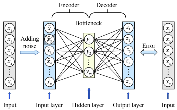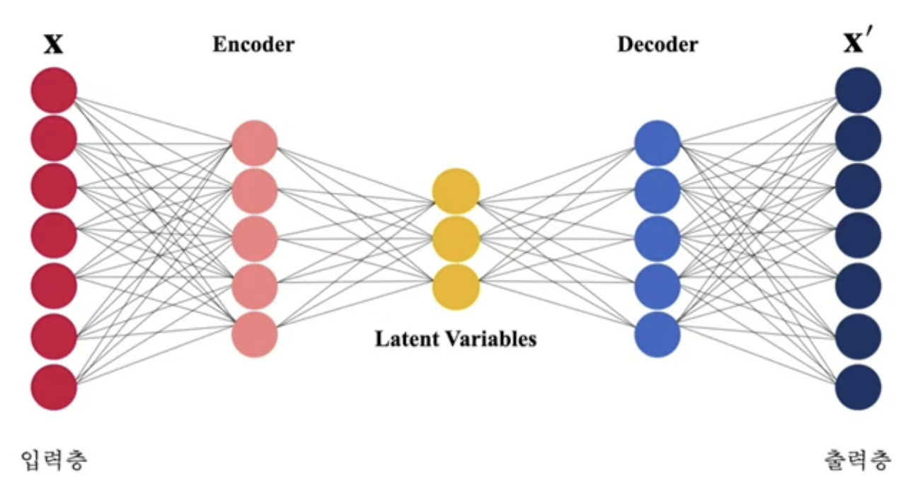 오토인코더는 정답 없이 모델을 학습시키는 비지도 학습 모델입니다. 일반적으로 대칭형 구조를 지니고 있으며, 입력 데이터를 압축하는 인코더(Encoder) 부분과 압축을 푸는 디코더(Decoder) 부분으로 구성되어 있습니다. 따라서 인코더를 통해 차원 축소가 된 잠재 변수(Latent variable)를 가지고 별도로 계산을 할 수도 있고 디코더를 통해 입력값과 유사한 값을 생성할 수도 있습니다. 기본적으로 입력값 x 와 출력값 $\acute{x}$ 를 이용하여 MSE 를 정의하고 이를 기준으로 학습을 진행합니다.
