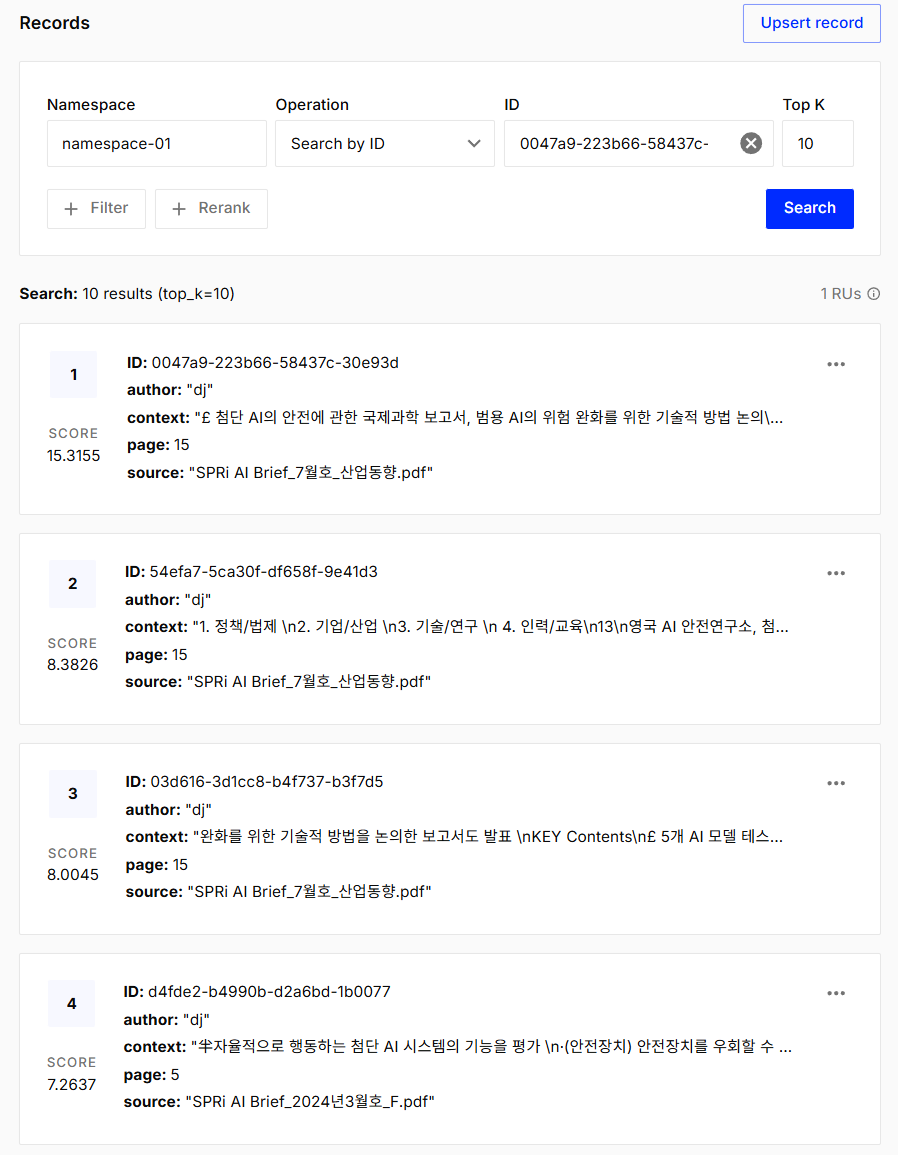 이번엔 반환할 문서 수 k개를 조절한 결과를 출력해 보도록 하겠습니다. k값은 1로 설정해 주었습니다.