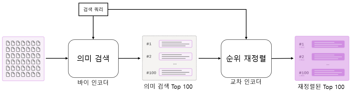 아래 그림과 같이 바이 인코더와 교차 인코더를 결합해 사용할 수 있습니다. 바이 인코더는 대규모 문서에서 검색 쿼리와 유사한 소수의 문서를 선별 합니다. 선별된 문서는 유사도를 더 정확히 계산할 수 있는 교차 인코더를 사용해 유사한 순서대로 재정렬합니다. 교차 인코더는 계산량이 많지만 소수의 선별된 문서를 대상으로 계산하기 때문에 정확하면서도 빠르게 계산할 수 있습니다.