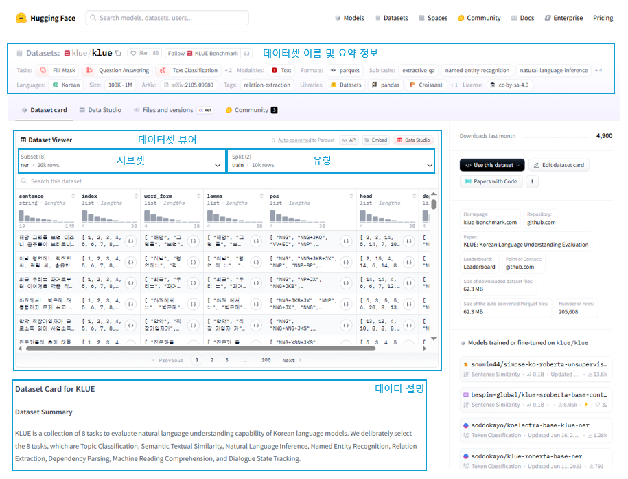 아래 그림 3은 이번에 실습에 사용할 KLUE 데이터셋 페이지입니다https://huggingface.co/datasets/klue. 데이터셋 페이지의 상단에서는 데이터셋의 이름과 작업 종류, 크기, 언어, 라이선스 등 요약 정보를 확인할 수 있고, 화면 중앙과 같이 데이터셋을 바로 확인할 수 있는 데이터셋 뷰어 기능을 제공합니다. 데이터셋 뷰어 아래로 데이터셋에 대한 설명을 제공합니다. 데이터셋에 대한 설명은 필수사항이 아니기 때문에 제공하지 않는 데이터셋도 있습니다.