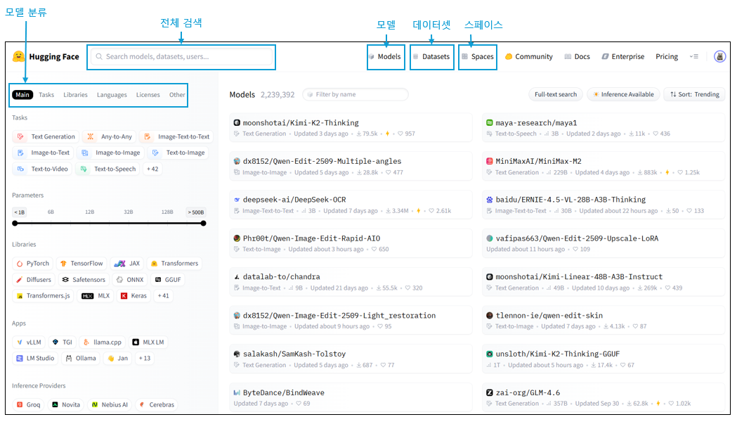 모델 허브에는 그림 1과 같이 어떤 태스크에 사용하는지, 어떤 언어로 학습된 모델인지 등 다양한 기준으로 모델이 분류되어 있습니다. 그림에서 ‘모델 분류’로 강조한 표시 박스 안에서 Tasks를 선택하면 작업 종류에 따라 모델을 필터링할 수 있습니다. 모델 허브를 통해 사용자는 자신이 필요한 작업 분야와 언어 등에 따라 활용할 수 있는 사전 학습 모델이 있는지 탐색할 수 있고 해당 분야에서 어떤 모델이 많이 사용되는지 확인할 수 있습니다. 또한 ‘전체 검색’으로 강조 표시한 박스에서 검색하면 모델, 데이터셋, 스페이스, 사용자 등을 검색할 수 있습니다.