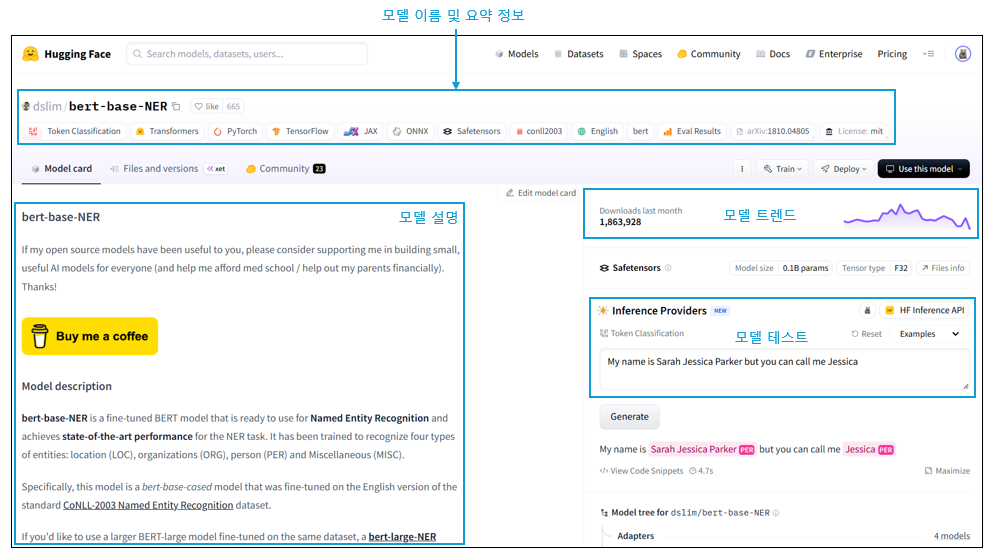 아래 그림 2는 BERT 기반 개체명 인식기 모델의 화면입니다. 상단에서 모델의 이름과 요약된 정보를 아이콘 형태로 확인할 수 있습니다. 어떤 작업을 위한 모델인지, 라이선스 유형 등을 확인할 수 있습니다. 왼쪽 아래에는 모델에 대한 설명이 있습니다. 필수사항은 아니기 때문에 모든 모델에 설명이 적혀 있는 것은 아니나, 잘 작성된 모델 카드의 경우 모델의 성능, 관련 있는 논문 소개, 사용 방법 등의 정보를 제공합니다. 오른쪽의 위에는 모델의 다운로드 수 추이를 볼 수 있는 모델 트렌드 그래프가 있고, 그 아래쪽에는 모델을 간단히 테스트해 볼 수 있습니다.