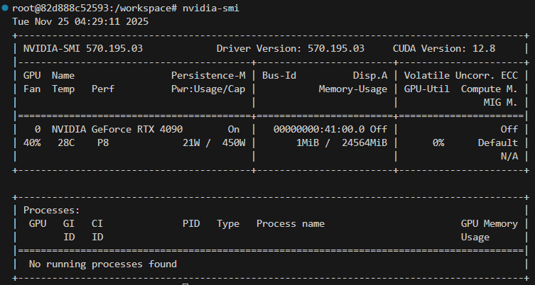 nvidia-smi를 입력하여 RTX 4090이 정상적으로 잡히는지 확인합니다.