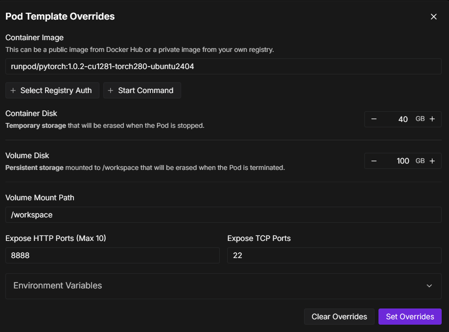 - Template: RunPod PyTorch 2.x (최신 버전)을 선택하는 것이 가장 무난합니다.