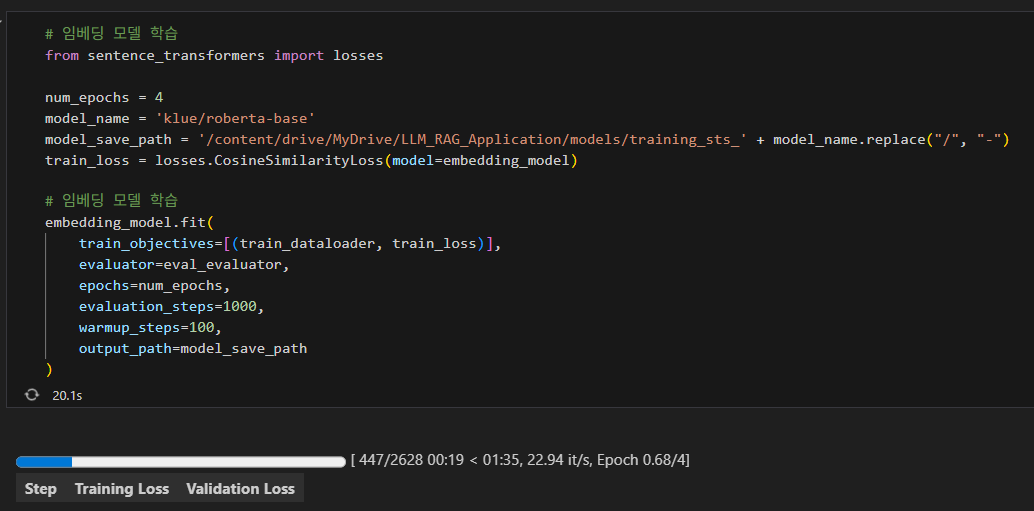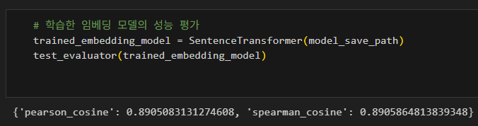 일단 현재 저의 저장소에는 이전에 작업하던 ipynb 파일이 있고, 해당 파일에는 klue/roberta-base 모델과 KLUE의 STS 데이터셋(두 문장이 얼마나 유사한지에 대한 데이터셋)을 이용해 입력의 문장 임베딩을 잘 생성하도록 학습하는 예제 코드가 있습니다.