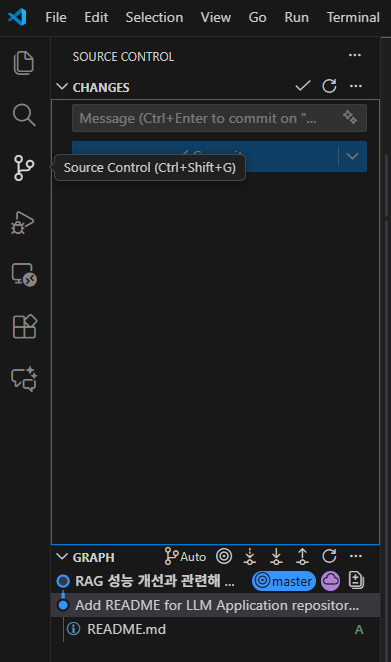 왼쪽 사이드바 메뉴를 보시면 “Source Control”이라는 메뉴가 있습니다. 이걸 클릭하시면 git에서 지원하는 기능들이 있어 그대로 사용하시면 됩니다.
