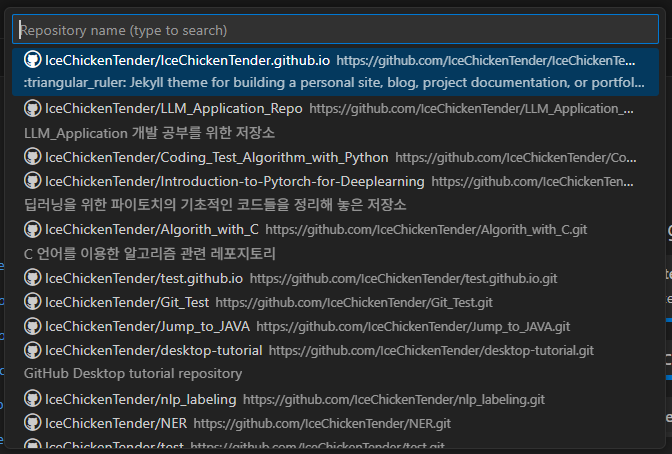 Clone from GitHub를 선택합니다. 그러면 아래 이미지와 같이 자신의 github repo 목록이 뜹니다. 여기서 사용하고자 하는 저장소를 선택해 줍니다.