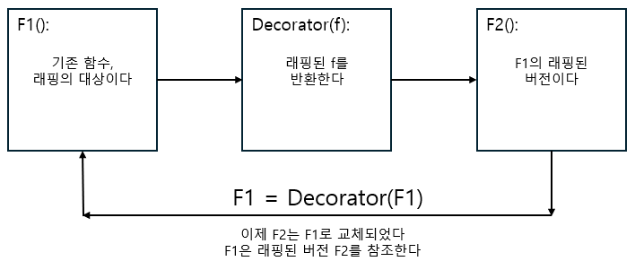 def키워드로 신규 함수를 정의하기 때문에 이 작업이 가능해진다. - 결국 함수 이름을 재대입하면서 기존 버전이 래핑된 버전으로 교체된다.