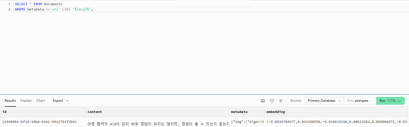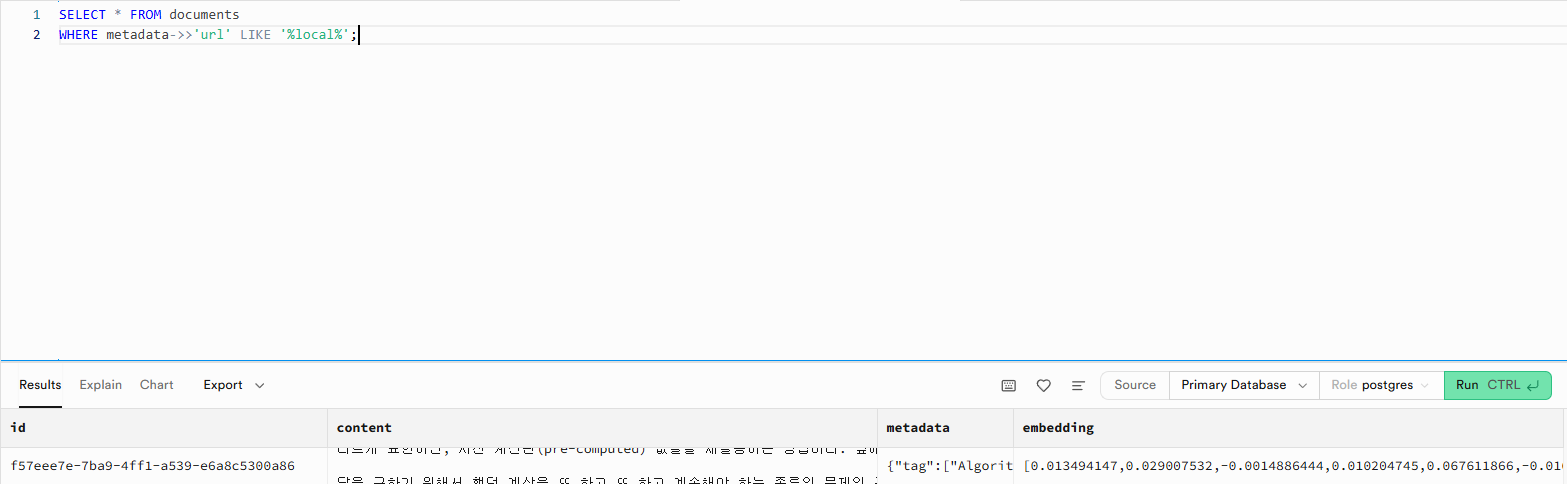 그리고 Supabase에서 자신의 프로젝트의 SQL Editor로 가서 다음 쿼리를 실행해 봅니다. 이 쿼리는 metadata에 있는 url 정보 중에 local이 포함된 데이터가 있다면 조회하도록 하는 쿼리입니다.