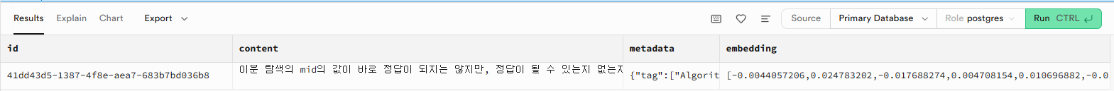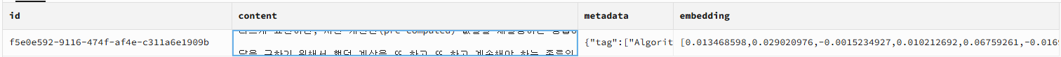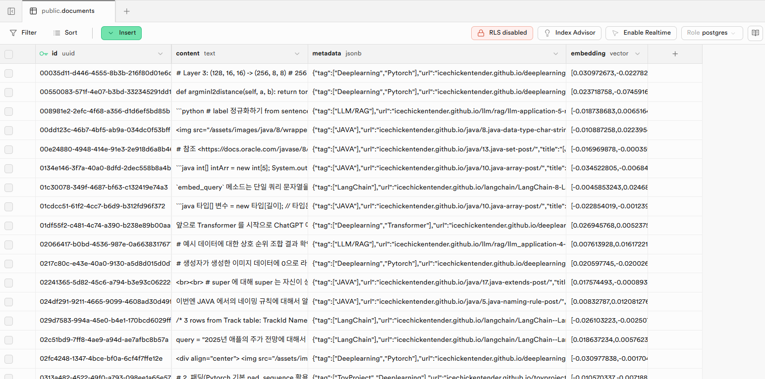 그리고 Supabase에 가서 벡터 DB에 해당 내용이 추가되었는지 확인을 해보면 아래 그림과 같이 추가된 것을 확인할 수 있습니다.