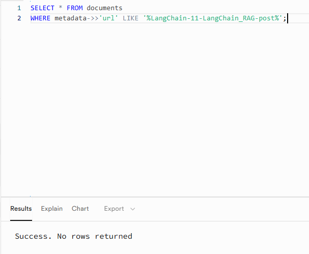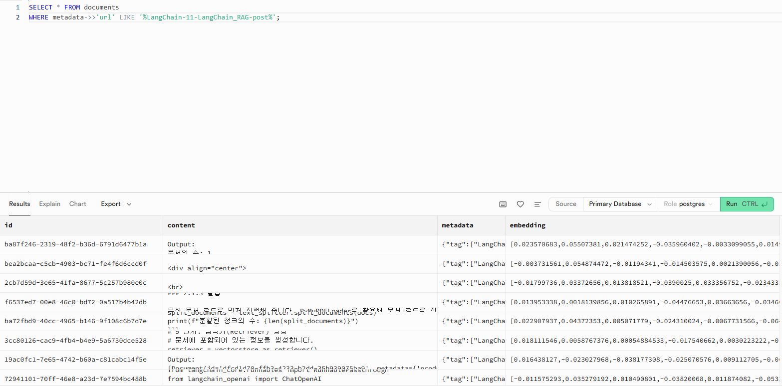 Supabase의 벡터 DB를 확인해 보면 아래 이미지와 같이 “LangChain-11-LangChain_RAG-post”로 조회를 했을 때 새로운 데이터들이 추가된 것을 확인할 수 있었습니다. 이를 통해 Github Actions를 이용한 포스트 데이터의 자동 전처리 및 임베딩화 그리고 벡터 DB에 적재되는 것까지 정상적으로 동작하는 것을 확인할 수 있었습니다.