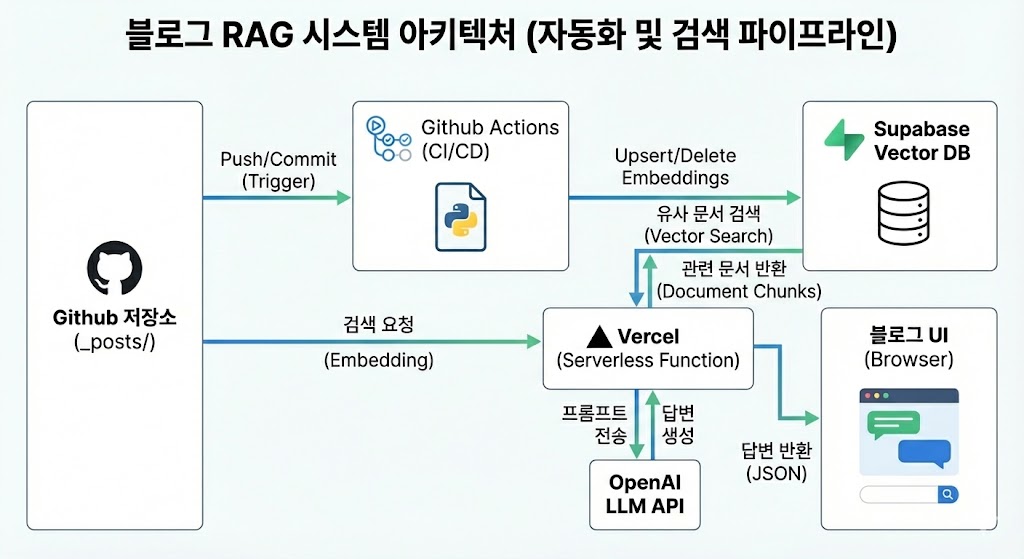 이번 포스트에서는 단순한 RAG 시스템을 구현하여 블로그 포스트 내용에 기반한 답변을 제공해 주는 AI 검색기를 만들어 보는 내용입니다. 이번 포스트에서 진행하는 프로젝트의 구성은 블로그 포스트들의 전처리(청킹, 임베딩), 벡터 DB 구축과 전처리된 데이터를 벡터 DB에 적재하기, 백엔드 서버를 이용해 쿼리를 임베딩화하고, 벡터 DB에서 쿼리가 가장 유사한 문서를 가져와 OpenAI의 gpt-4o-mini 모델에게 쿼리와 함께 쿼리와 가장 유사한 문서를 함께 보내 답변을 받아오기, 마지막으로 github 블로그의 github 저장소에 포스트가 추가, 삭제, 수정될 때마다 벡터 DB에서 추가, 삭제, 수정이 되도록하는 자동화 과정까지입니다. 전체 시스템 아키텍처는 아래 이미지와 같습니다.