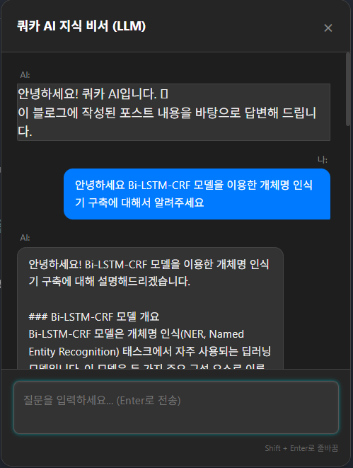구현한 UI/UX 기능 테스트를 먼저 진행해 보겠습니다. 아래 이미지들을 보면 로컬 환경이 아닌 온라인으로 접속 가능한 블로그에 구현한 정보 검색 기능이 구현된 것을 확인할 수 있으며, 질문을 했을 때 답변을 해주는 것도 확인할 수 있습니다.